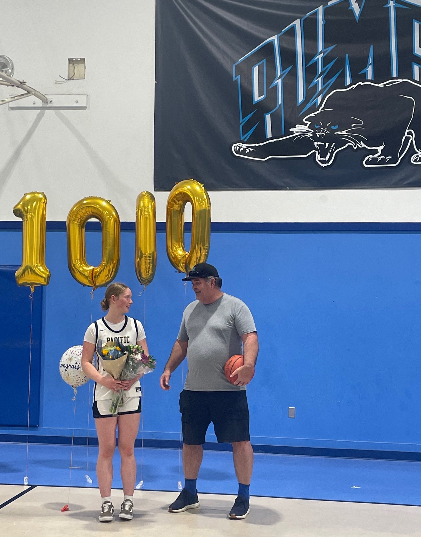 As Athletic Director Todd Osborne put it, "Not only did Kat score more than 35 points to blow past 1000 points, but she did it the first half of our home game against Seaside." Kat's athleticism is matched with incredible sportsmanship, which was on display in the small post-game ceremony marking her achievement. Only after thanking her coaches, teammates and Mr. Osborne for their support did she say with a smile that she's proud to have reached the 1000 point milestone.